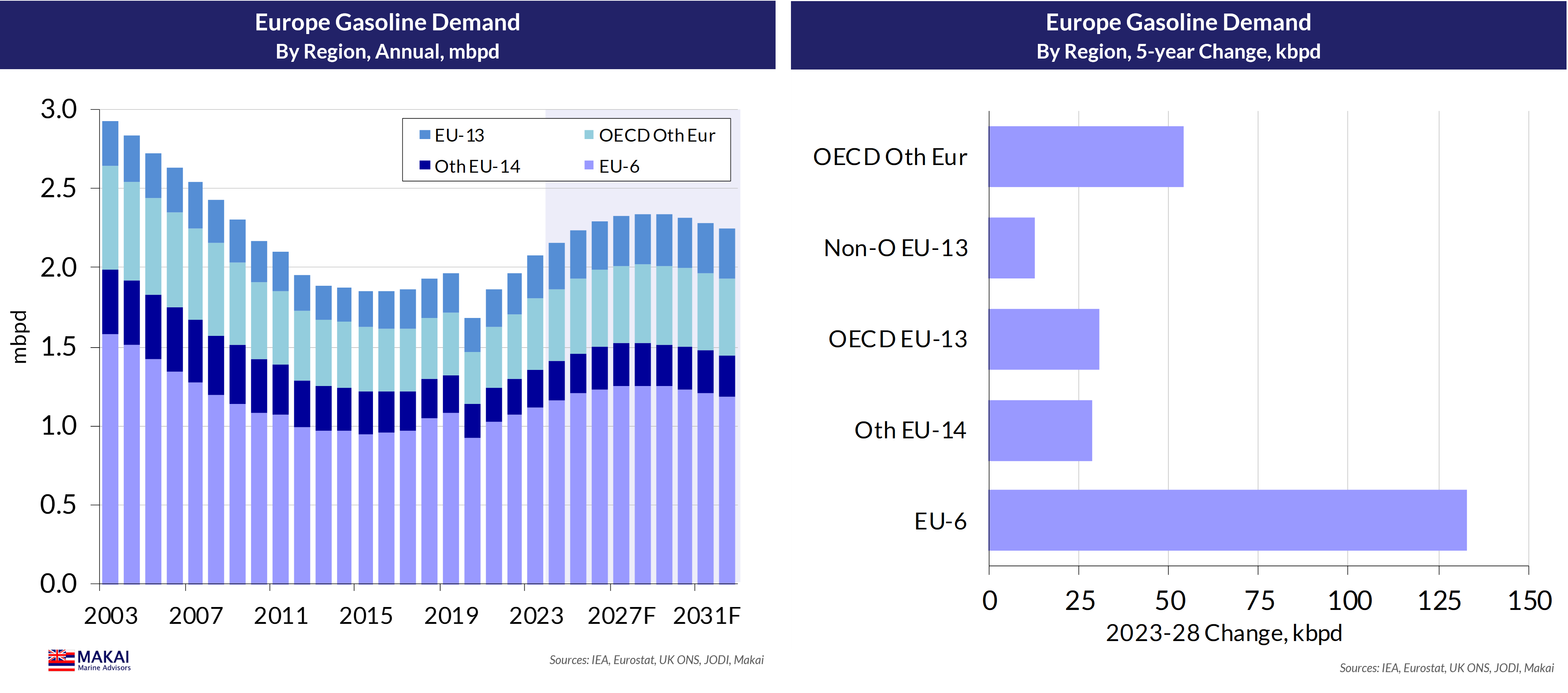 The type of power source in European auto sales varies dramatically between countries, but given the relative size of automotive fleets and petrol demand, core Europe is set to provide the bulk of the gasoline demand growth in Europe.