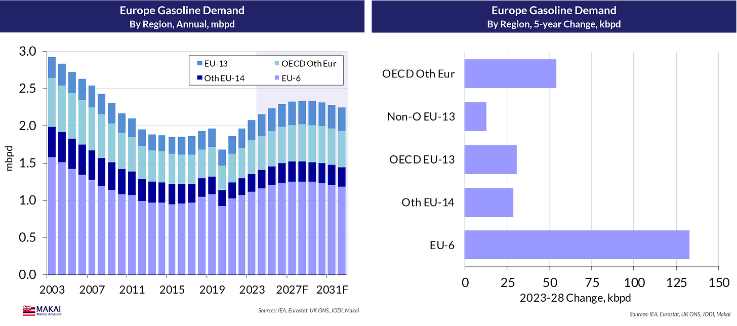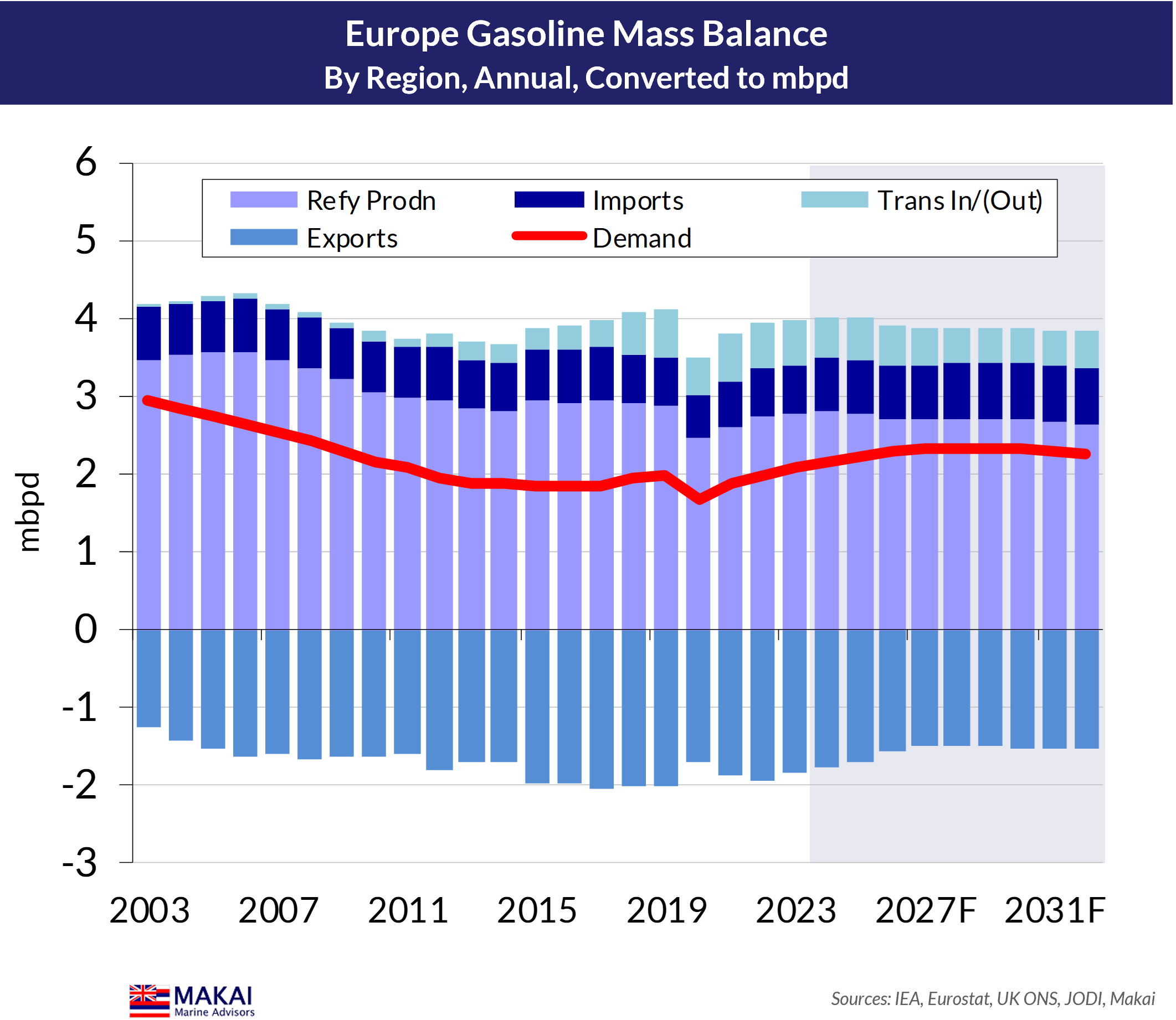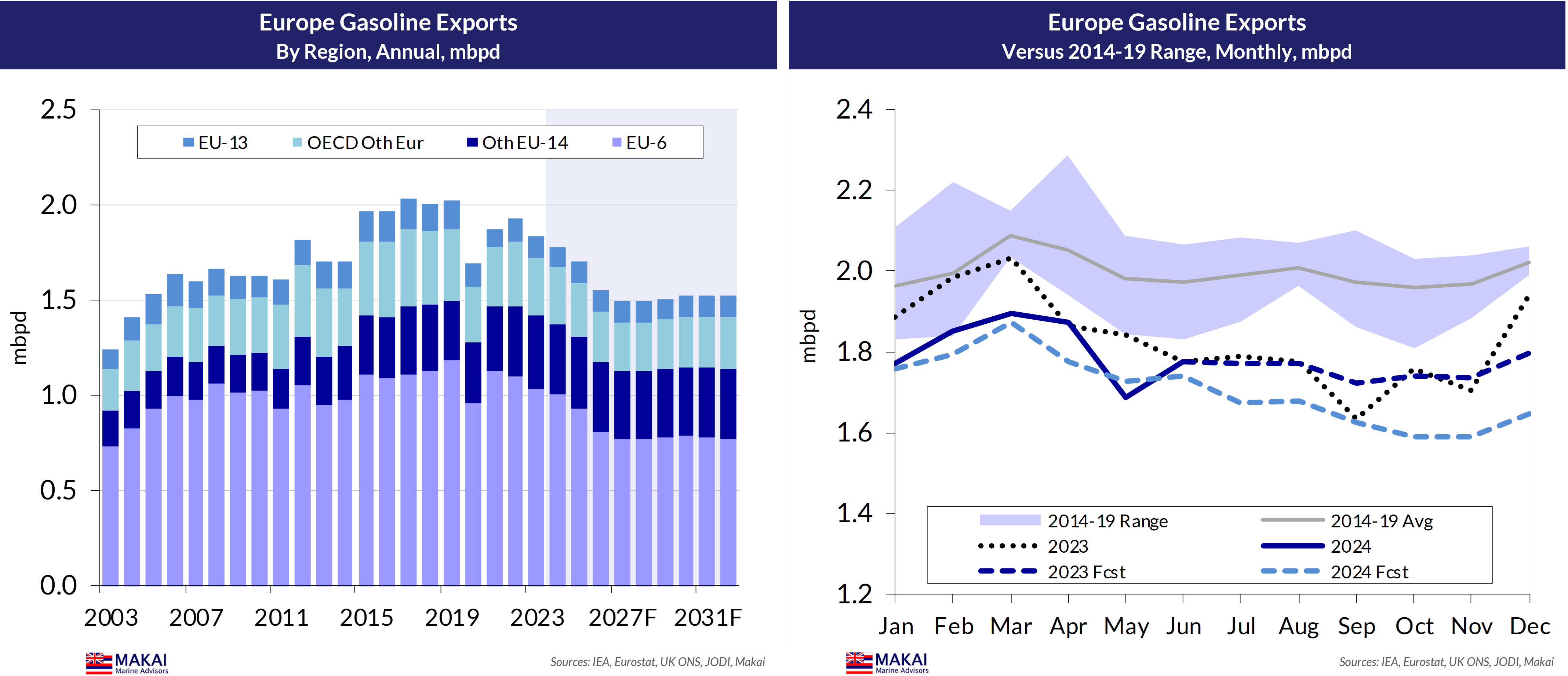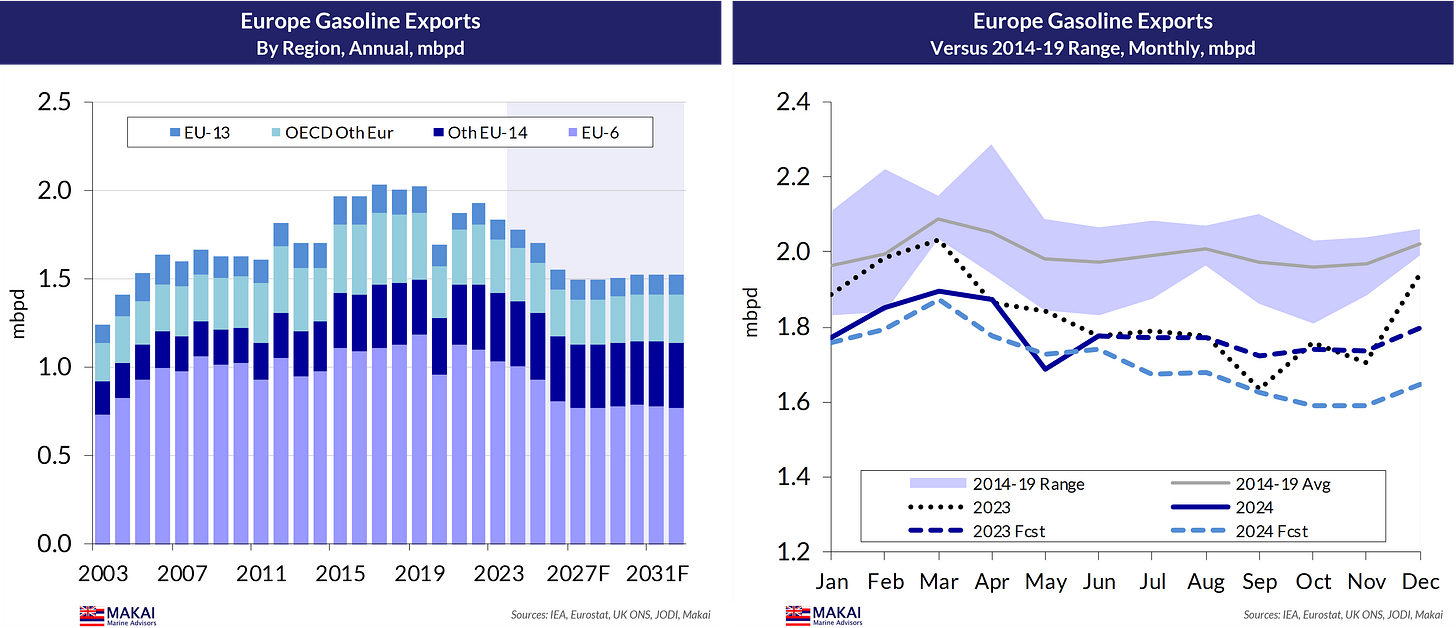 In fact, European gasoline exports are poised to fall as much as 350 kbpd through 2027 (below left), with declines accelerating in 2h25 with refinery closures.