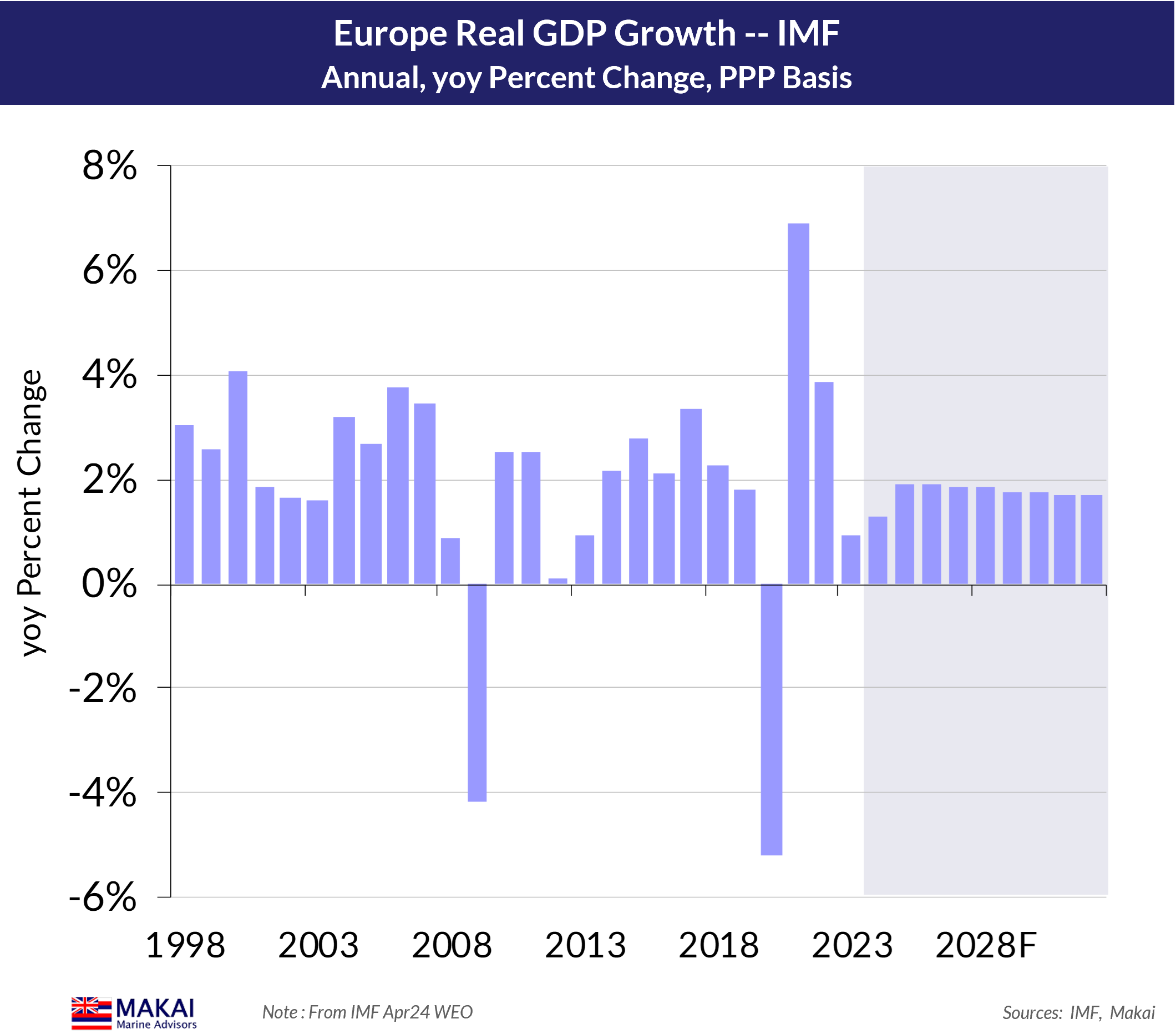 In its typical cheery fashion, the IMF has delayed the anticipated Eurozone rebound until 2025, with total European growth accelerating to 1.9% (below).