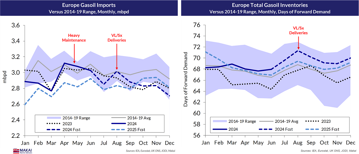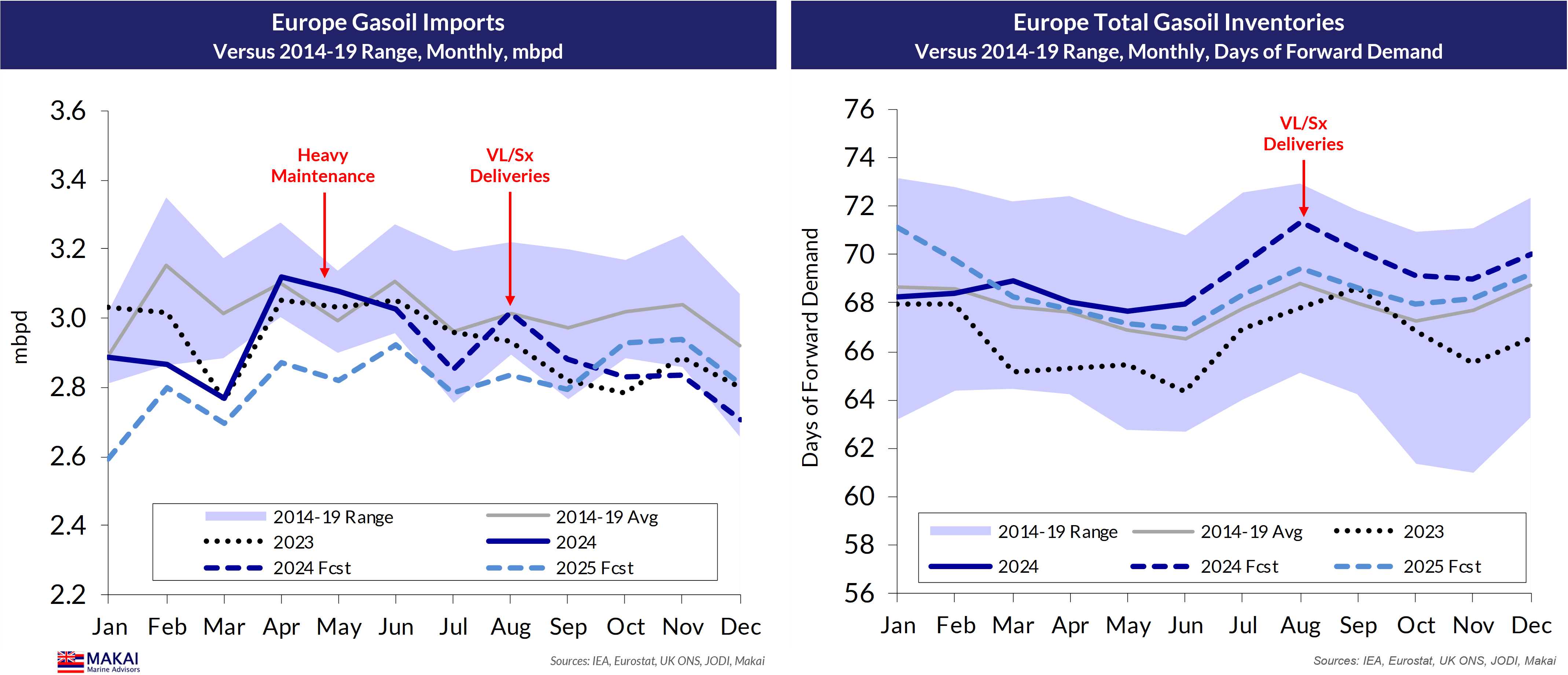 Inevitably, the impact of the initial VLCC and Suezmax deliveries are emerging in the inventory data. Euroilstock has reported that mid-distillate inventories of the Europe 16 countries have jumped by 7.94 million barrels (MB) during August. Insights Global data has revealed a similar movement, with ARA gasoil inventories now at 19.1 MB. As shown in the above charts, this level of inventory expansion should depress the level of required 4q24 imports into Europe, even if days of stocks remain above recent levels and averages.