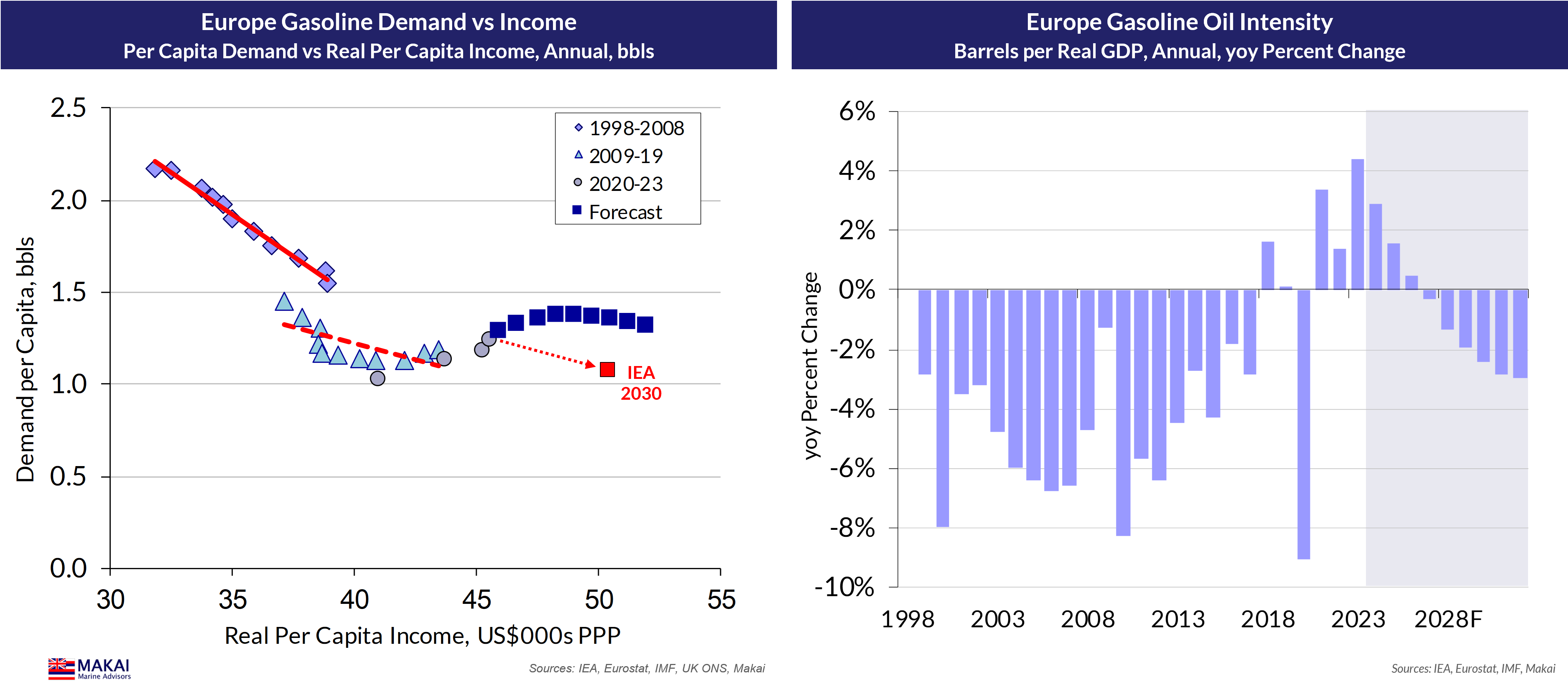 Even with some slowing in gasoline oil intensity (right above), petrol demand per capita should remain well above the IEA’s demand forecast in its Oil 2024 report (left).