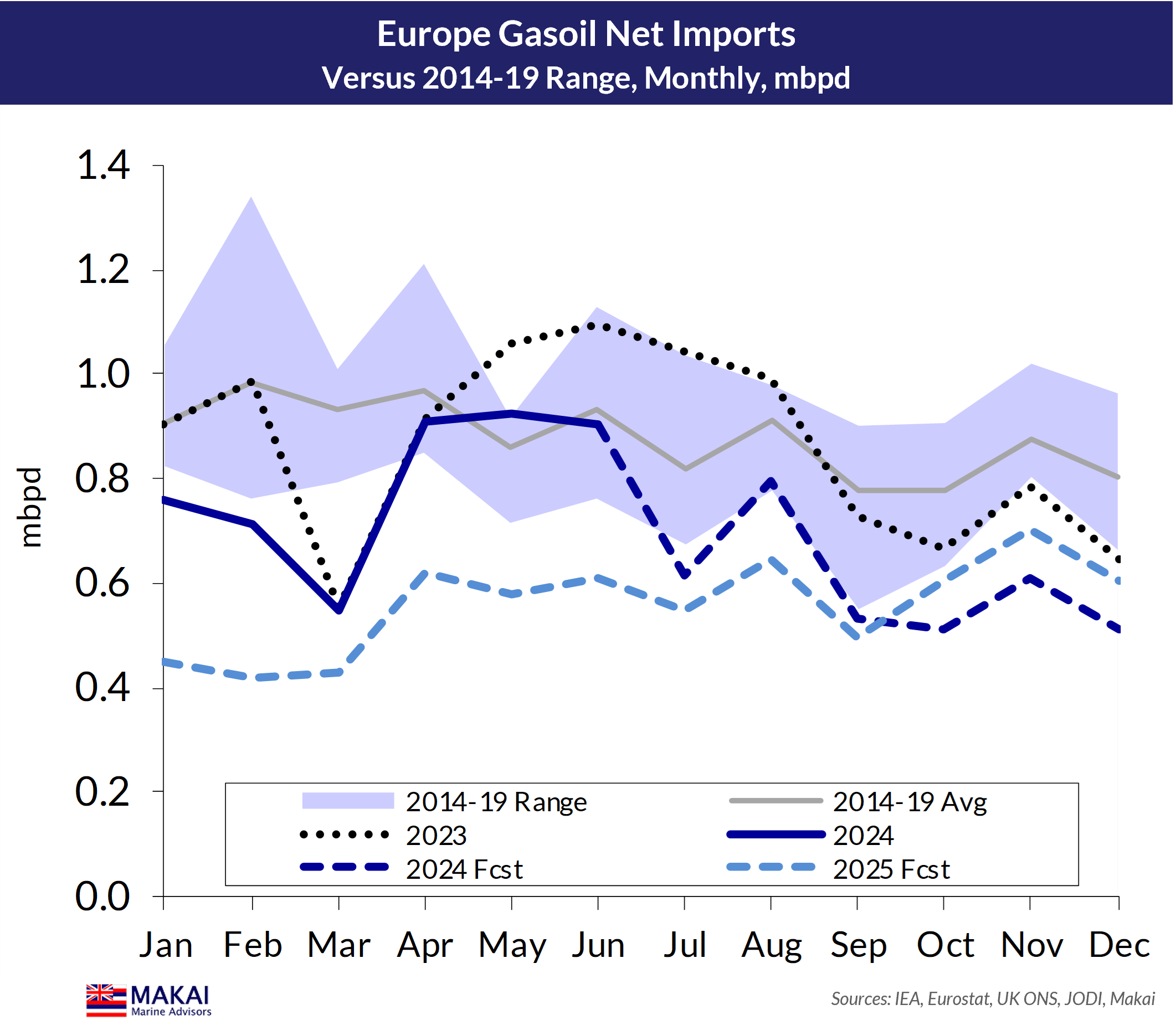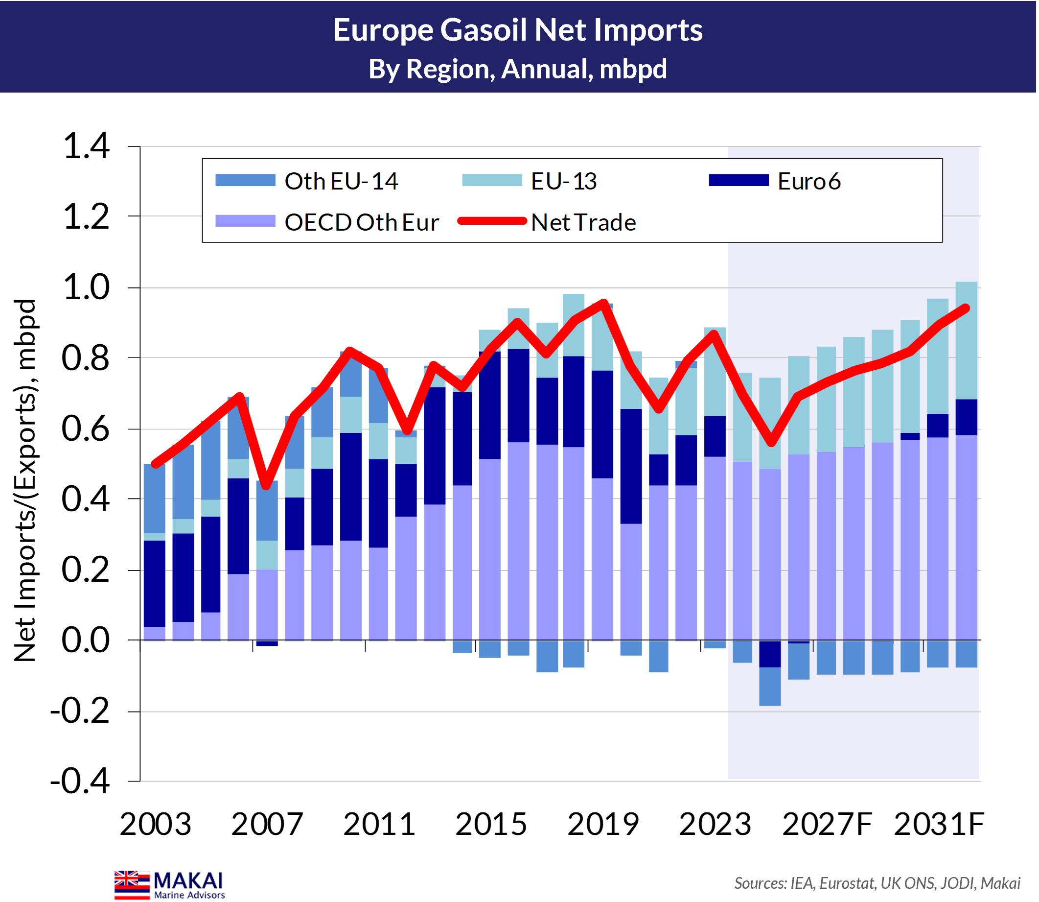 With a decline in gasoil production from the 2025 refinery closures in Germany and the UK, European gasoil imports take a 170 kbpd jump higher in 2026. Without the recent de-dieselisation, however, imports would be 350 kbpd higher in 2026, or the equivalent of 24 extra LR2s from the AG.