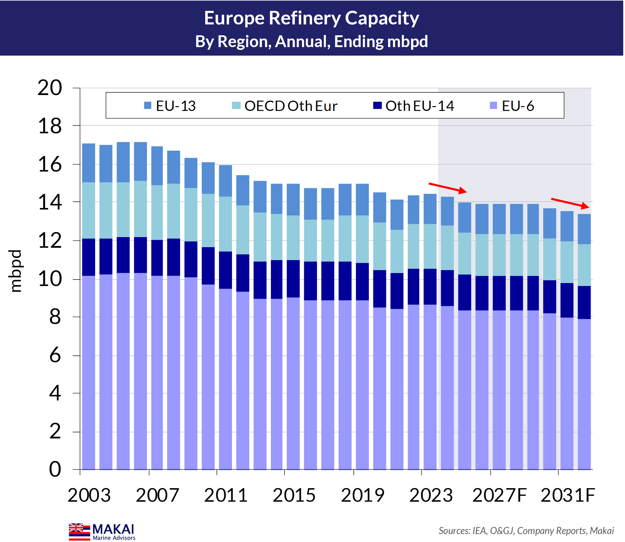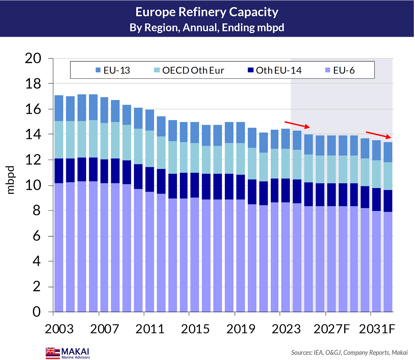 These announcements follow this year’s conversion of ENI’s 84 kbpd Livorno refinery into a biofuels facility, implying 460 kbpd of total European capacity losses for 2024-25, or about 3% of the total.