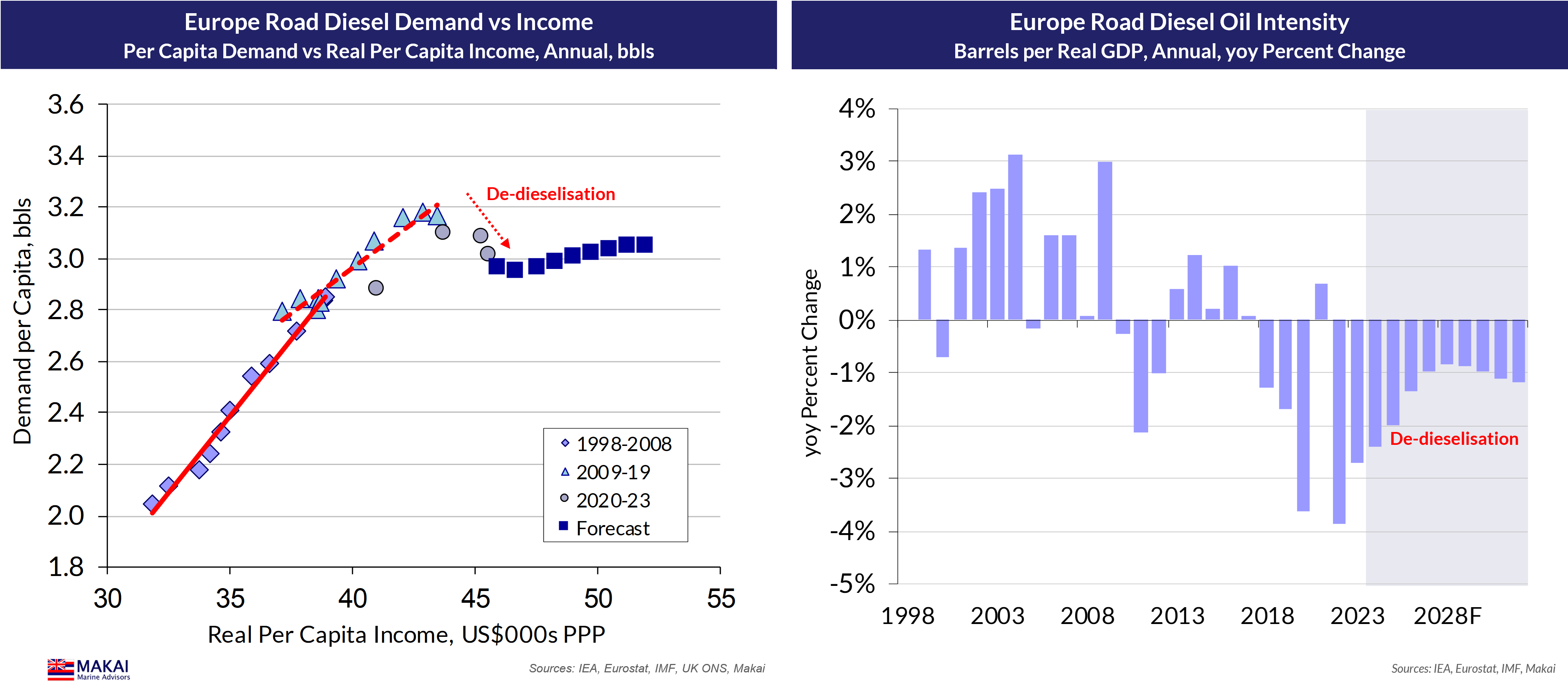 This dynamic plays out in regional demand differences, in which the faster-growing EU-13 economies (and Turkey in OECD Other Europe) drive much higher trucking diesel demand growth than core Europe, offsetting more modest de-dieselisation in those countries.