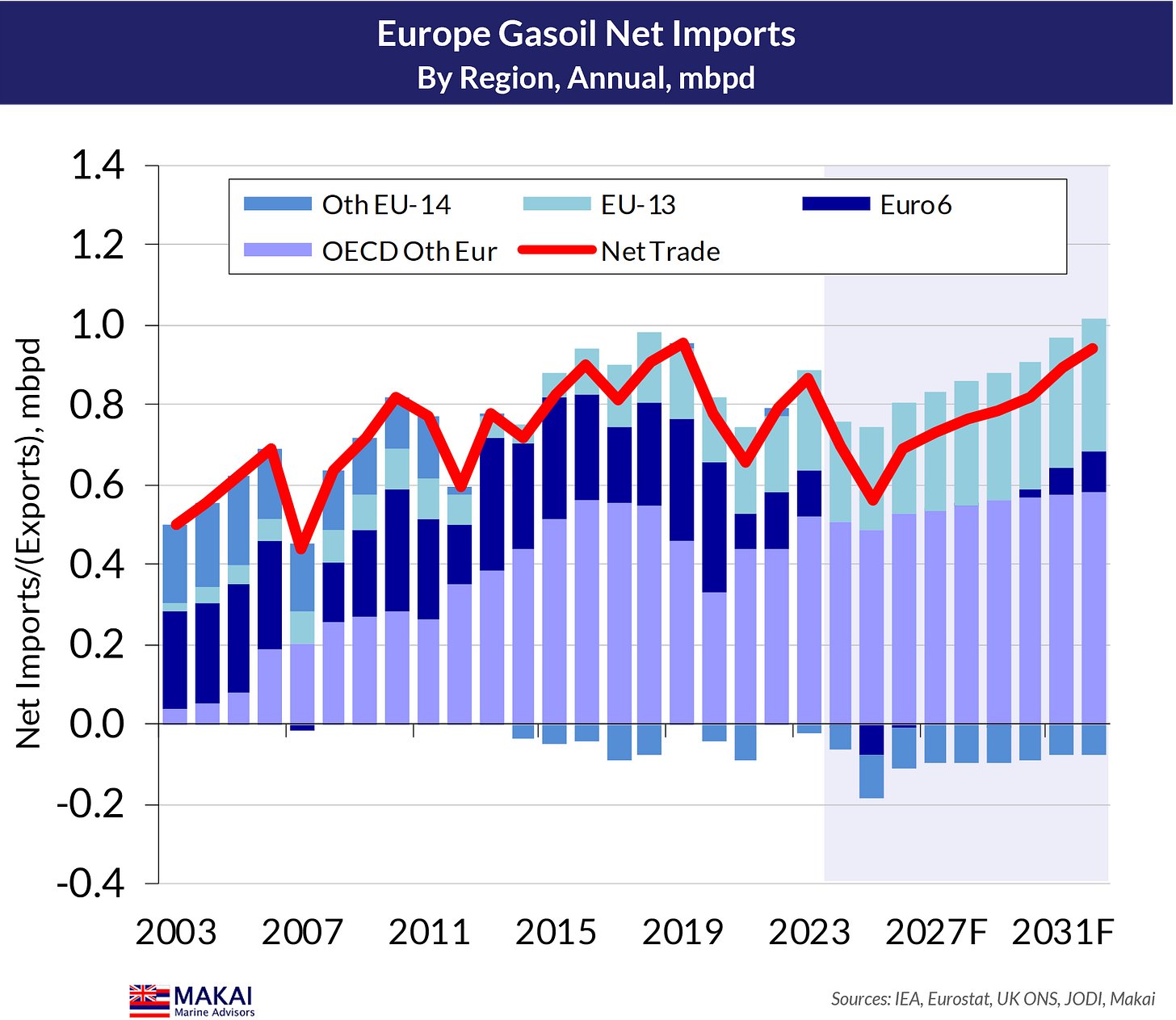 With intra-regional trade providing 60% of Europe’s gasoil imports, net imports are the more relevant measure, and the above chart shows the impact from de-dieselisation and the loss of refining capacity. Net imports take a similar 130 kbpd jump in 2026.
