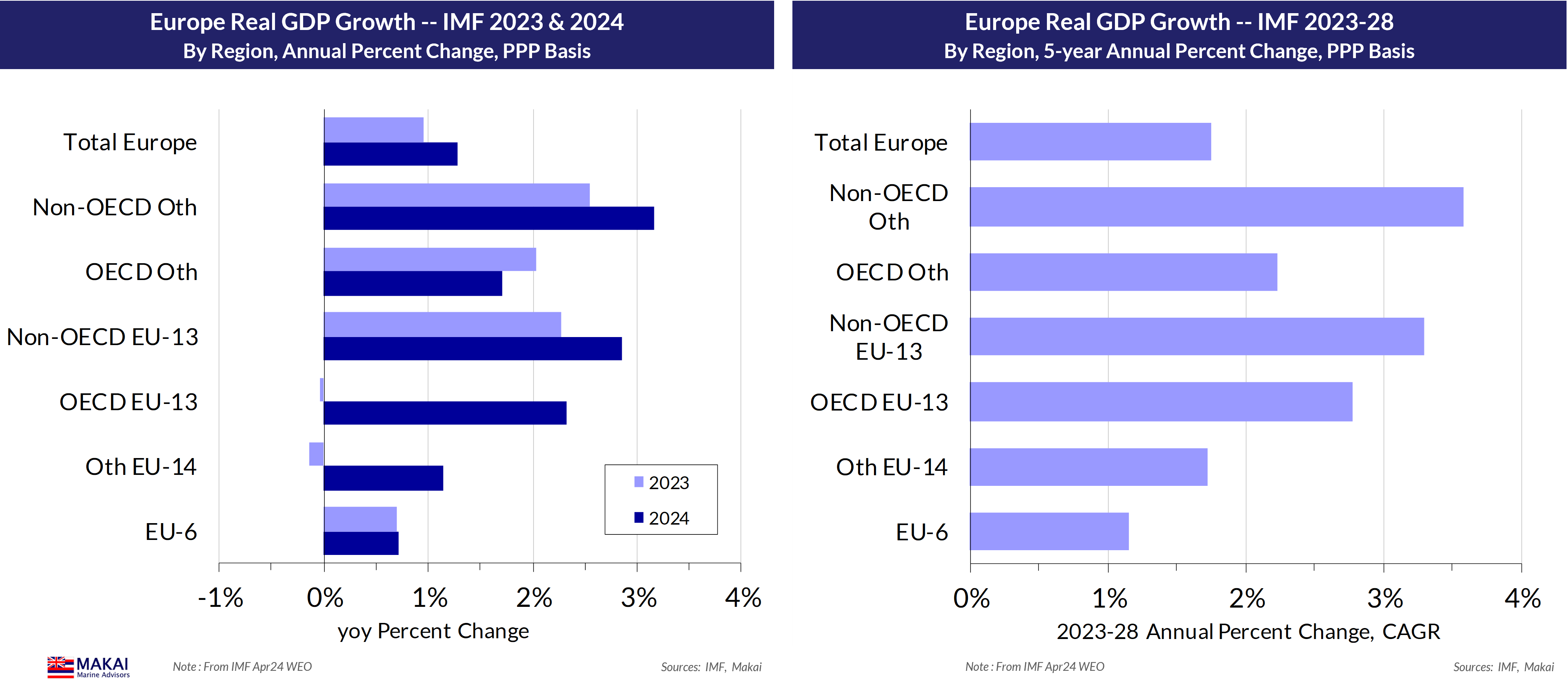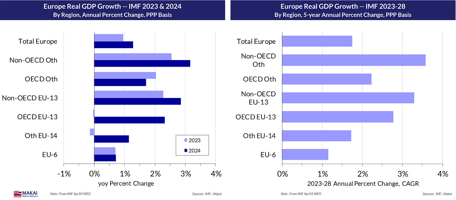 European macro continues to struggle – A lingering manufacturing recession in core Europe is delaying expectations for a sustained macroeconomic recovery, as the IMF has lowered forecasts for 2024. Faster growth in the EU-13 and non-OECD Europe is offsetting the core Europe malaise.