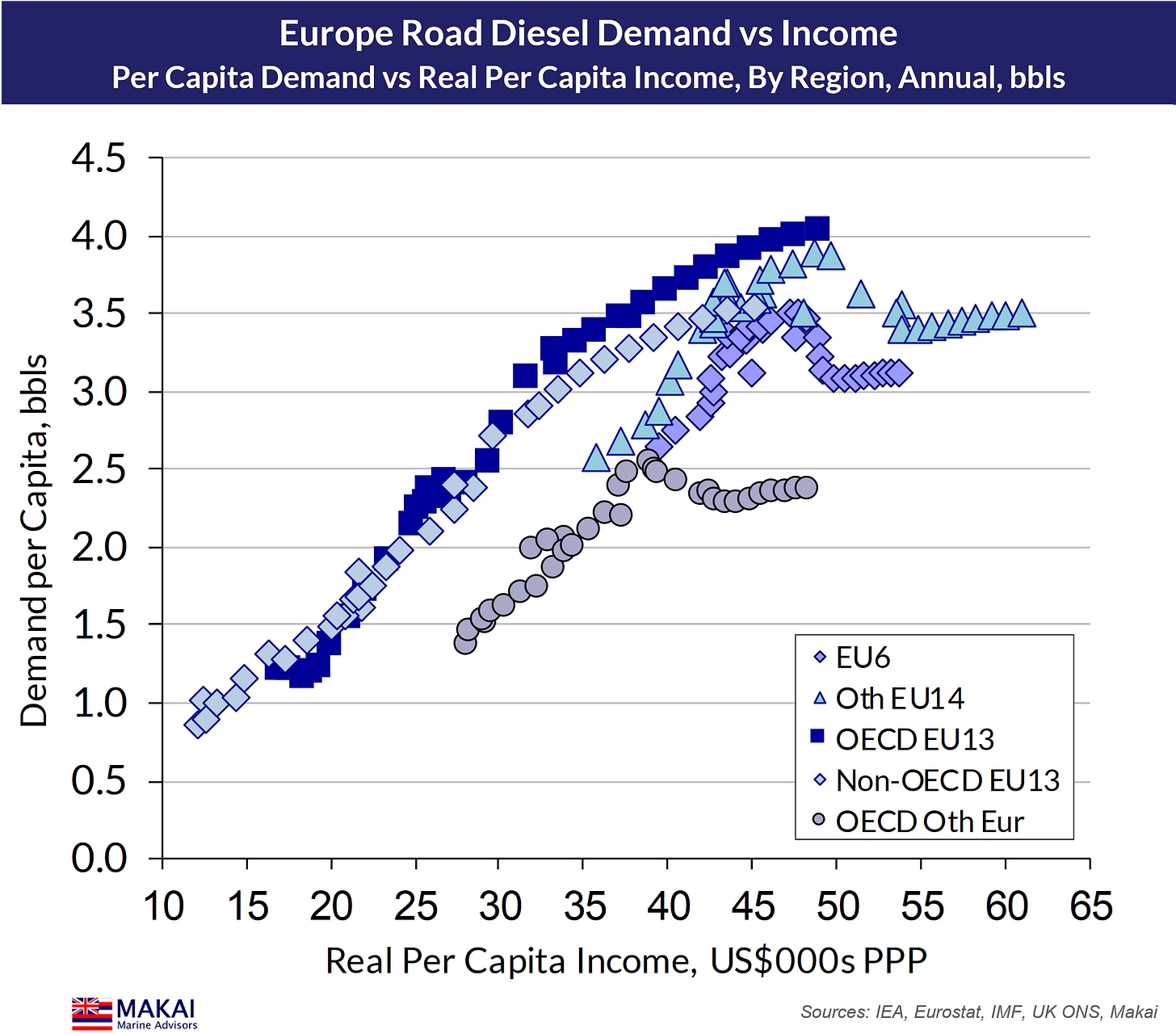 This is also evident in the above chart, in which the EU-13 countries continue their diesel income elasticity from rapid growth, while core Europe shows the de-dieselisation jolt downwards.